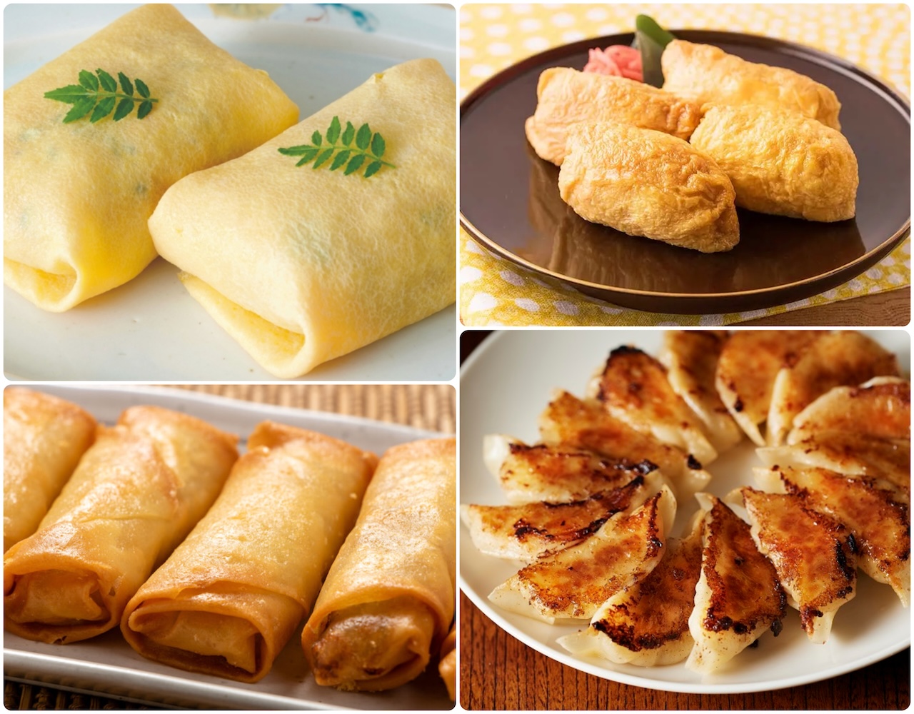 On the bottom, left are haru maki spring rolls stuffed with shreds of meat and vegetables. At the far right on the bottom are yaki gyoza, pan-fried dumplings. Wrappers are of various textures, from soft and chewy fried tofu, to crisp, crunchy spring rolls. All of these morsels can be consumed whole.
