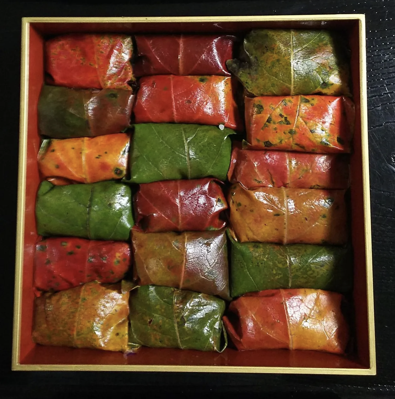 Inedible wrappers often provide antibacterial benefit to the foods enclosed in them. One colorful example is persimmon leaves, kaki no ha 柿の葉.